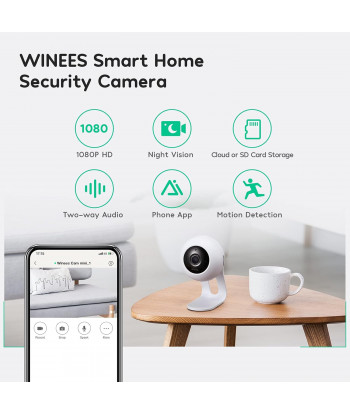 Il Winees WP01002 è una mini telecamera di sicurezza domestica che supporta la connettività Wi-Fi a 2,4 GHz (non 5 GHz) e dispone di risoluzione 1080p con visione notturna, rilevamento del movimento e audio bidirezionale. La telecamera utilizza l'app Aidot e richiede una velocità di download/upload di almeno 1 Mbps per lo streaming video.